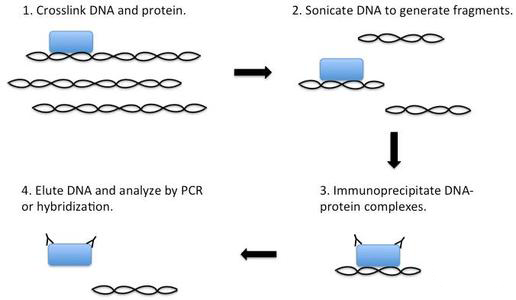 染色質(zhì)免疫沉淀技術(shù)(Chromatin immunoprecipitation assay, ChIP)是研究體內(nèi)環(huán)境下DNA與蛋白質(zhì)互作的方法,常用于體內(nèi)轉(zhuǎn)錄因子結(jié)合位點等方面的研究。其基本原理是在活細胞狀態(tài)下固定蛋白質(zhì)-DNA復(fù)合物,并將其隨機切斷為一定長度范圍內(nèi)的染色質(zhì)小片段,然后通過免疫學(xué)方法沉淀此復(fù)合體,特異性地富集目的蛋白質(zhì)結(jié)合的DNA片段,通過對目的片斷的純化與檢測,從而獲得蛋白質(zhì)與DNA相互作用的信息。